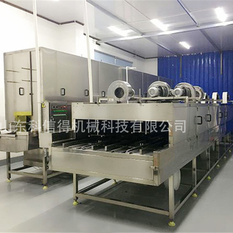 山东科信得洗筐机,周转筐清洗机是针对各种周转筐设计的清洗,除油,消毒和综合清洗设备,该设备操作简便,性能安定。它是食品加工企业必备的完美清洁设备。我公司生产的篮式洗衣机通过不锈钢链条将旋转篮取下并清洗后,依次经过碱性水→高压热水→平常。调温自来水→消毒水→等,以清洗篮筐并同时完成消毒和风干;清洁专用篮时,可在热碱水清洁段后加刷子以擦洗篮的底部和左右两侧,以提高清洁效用。采用连续清洗提高清洗效率。主体采用SUS304不锈钢板制成,保健清洁。喷嘴采用食品级耐高温塑料喷嘴或不锈钢喷嘴。清洁出发点可调。上,下,左,右用到不同的型号,以免产生死角并确保清洁。马达速度可通过机械无级或变频开展调节。适用于清洁度不同的篮子。两侧的护栏导轨均可左右调节。适用于清洗不同尺码的篮子。顶部喷管可上下调节,适用于清洗不同高度的篮子。碱性水和热水箱可以通过蒸汽加热或电加热加热,自动控温。