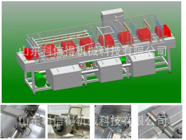 山东科信得洗筐机,周转筐清洗机是针对各种周转筐设计的清洗,除油,消毒和综合清洗设备,该设备操作简便,性能安定。它是食品加工企业不可或缺的完美清洁设备。我公司生产的洗筐机将篮筐从不锈钢链条中清洗到洗衣机中,然后经过碱水→高压热等多个过程。水→常温自来水→消毒水→等,以清洗篮筐并同时完成消毒和风干;清洁专用篮时,可在热碱水清洁段后加刷子以擦洗篮的底部和左右两侧,以提高清洁功效。采用连续清洗,以提高清洗效率。本公司生产的篮式洗衣机的主体由SUS304不锈钢板制成,保健清洁,喷嘴采用食品级耐高温塑料喷嘴或不锈钢制成喷嘴。清洁出发点可调。上,下,左,右用到不同的型号以避免死角并确保清洁。电机速度可通过机械无级或变频调节。适用于清洁度不同的篮子。两侧的护栏导轨均可左右调节。适用于清洗不同尺码的篮子。顶部喷管可上下调节,适用于清洗不同高度的篮子。碱性水和热水箱可以通过蒸汽加热或电加热加热,自动控温。